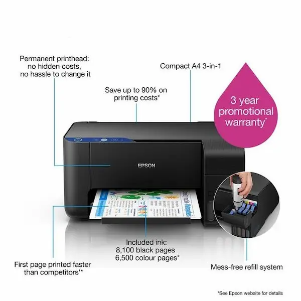 Three whole years1 – that’s how long you could go without buying more ink for the L3111. This means it can save you up to 90% on the cost of ink2. Giving you an extremely low cost per page, it produces up to 8,100 pages in black and 6,500 in colour with the included ink3.